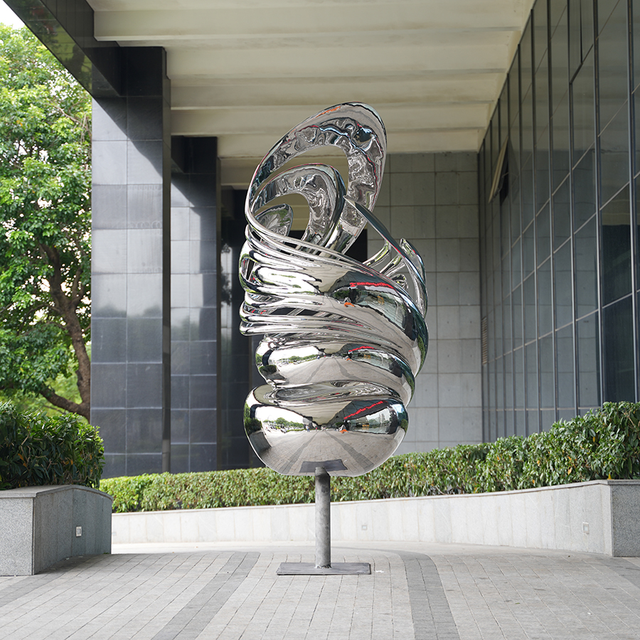 This 2.5-meter high stainless steel abstract sculpture features a dynamic, ribbon-like form with a striking mirror-polished finish. Its twisting and layered design creates a sense of movement and fluidity, reflecting light and surroundings in captivating ways. Crafted from high-quality stainless steel, this monumental artwork is both durable and visually impactful, making it perfect for outdoor plazas, corporate entrances, luxury hotels, and modern public spaces.