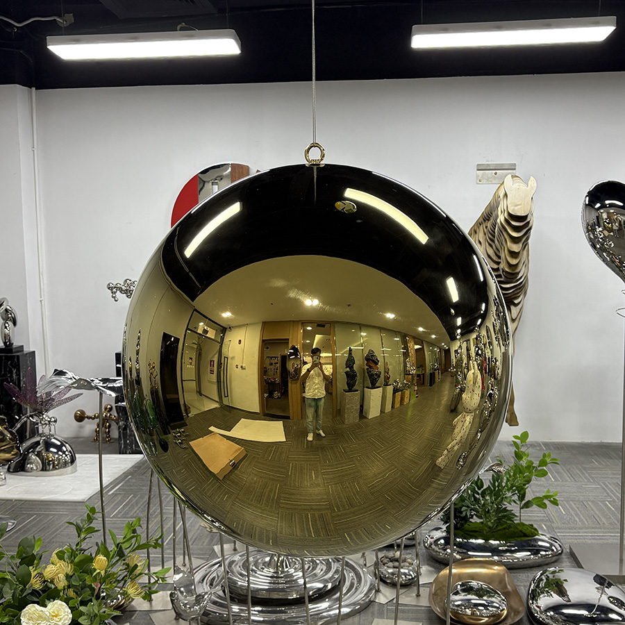 This 90 cm stainless-steel golden ball sculpture brings a modern, luxurious touch to any interior environment. The artwork features a perfectly spherical form finished in a high-gloss gold mirror coating, creating a dazzling focal point that reflects its surroundings with exceptional clarity.
