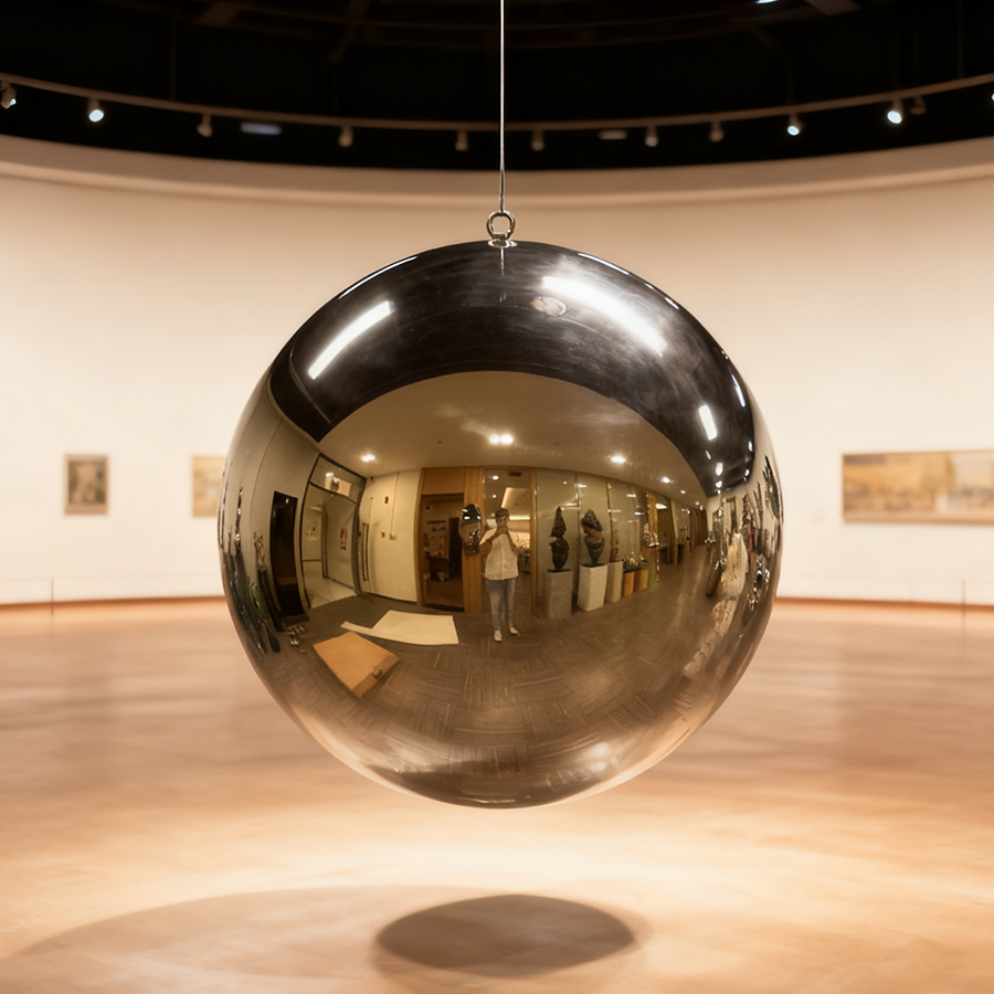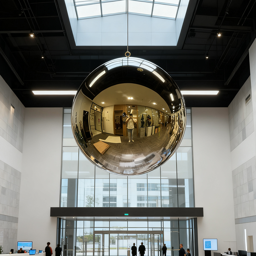 Crafted from premium 304 stainless steel, the piece is suspended from the ceiling, producing a sense of levitation and balance — ideal for hotel lobbies, art galleries, modern offices, and luxury residences. The mirror-polished surface not only amplifies space and light but also evokes a serene, contemporary aesthetic.