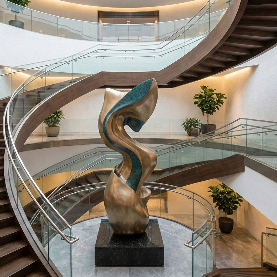 Crafted from premium stainless steel, the sculpture combines a warm metallic tone with contrasting textured accents, enhancing depth and material richness. The smooth, continuous surfaces reflect ambient light, while the twisting silhouette introduces rhythm and elegance into large open spaces such as corporate lobbies, financial institutions, office atriums, and luxury commercial interiors.