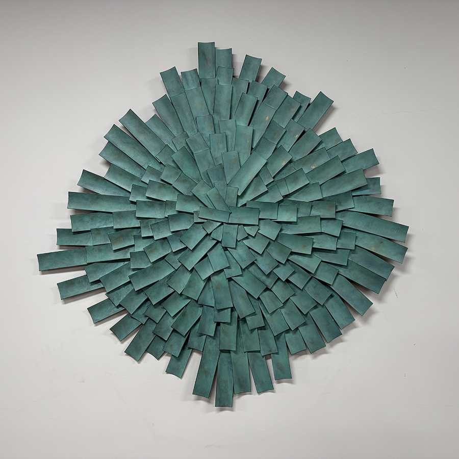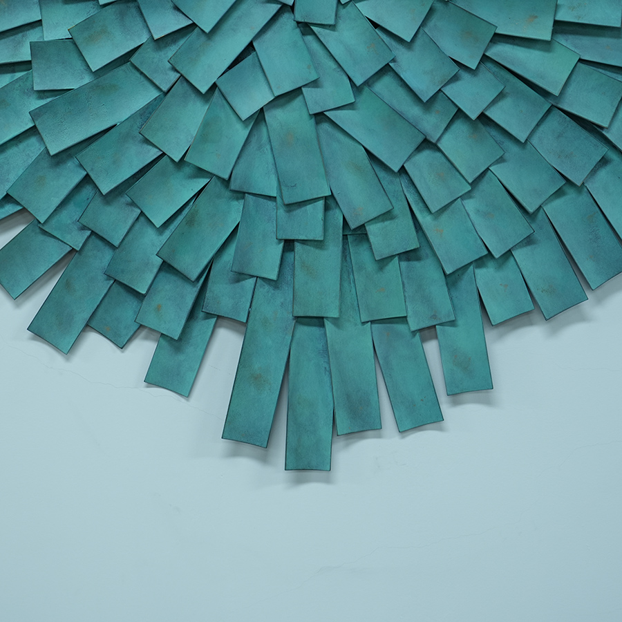 The sculpture is finished in a soft teal-green patina coating, adding warmth and artistic texture while maintaining the durability and longevity of stainless steel. The overlapping metal segments form a dynamic, sunburst-like structure that subtly changes appearance as natural and ambient light interact with the surface throughout the day.