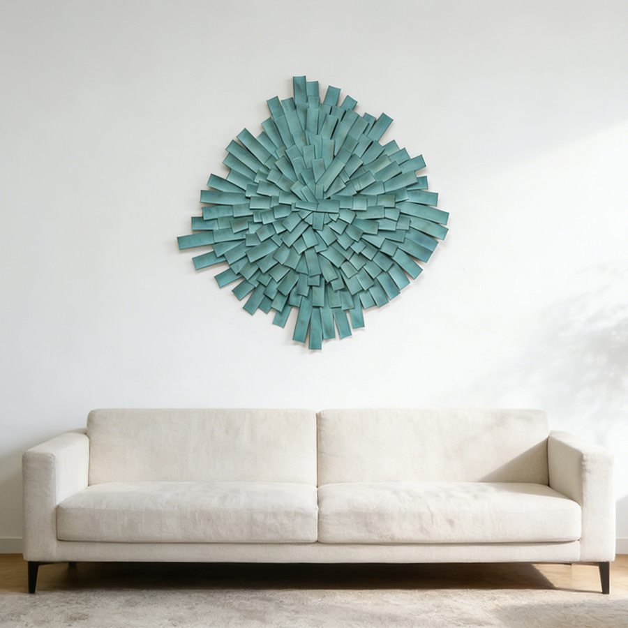 Elevate your interior with our handcrafted “Emerald Radiance” stainless steel wall sculpture. Featuring a stunning teal patina and a modern radial sunburst design, this luxury metal artwork is the perfect statement piece for modern living rooms and executive offices. Custom sizes available.