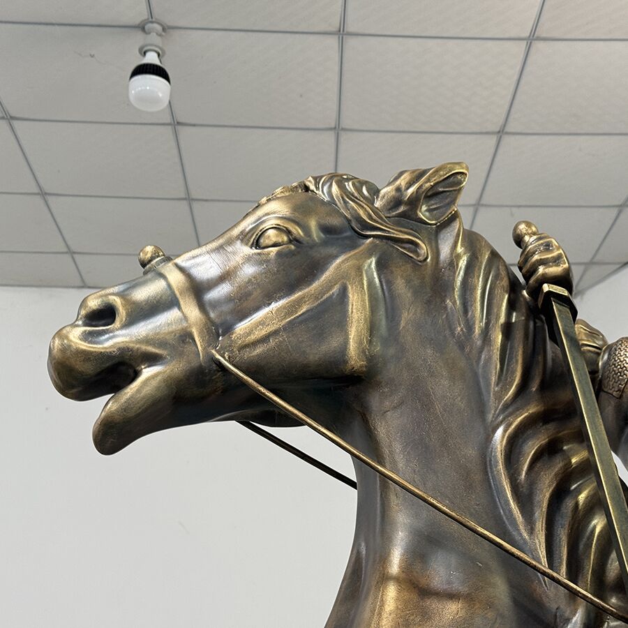 This fiberglass warrior on horseback sculpture features a lifelike bronze finish and heroic design. Ideal for luxury interiors, hotels, and museums, it brings timeless strength and elegance to any space.
