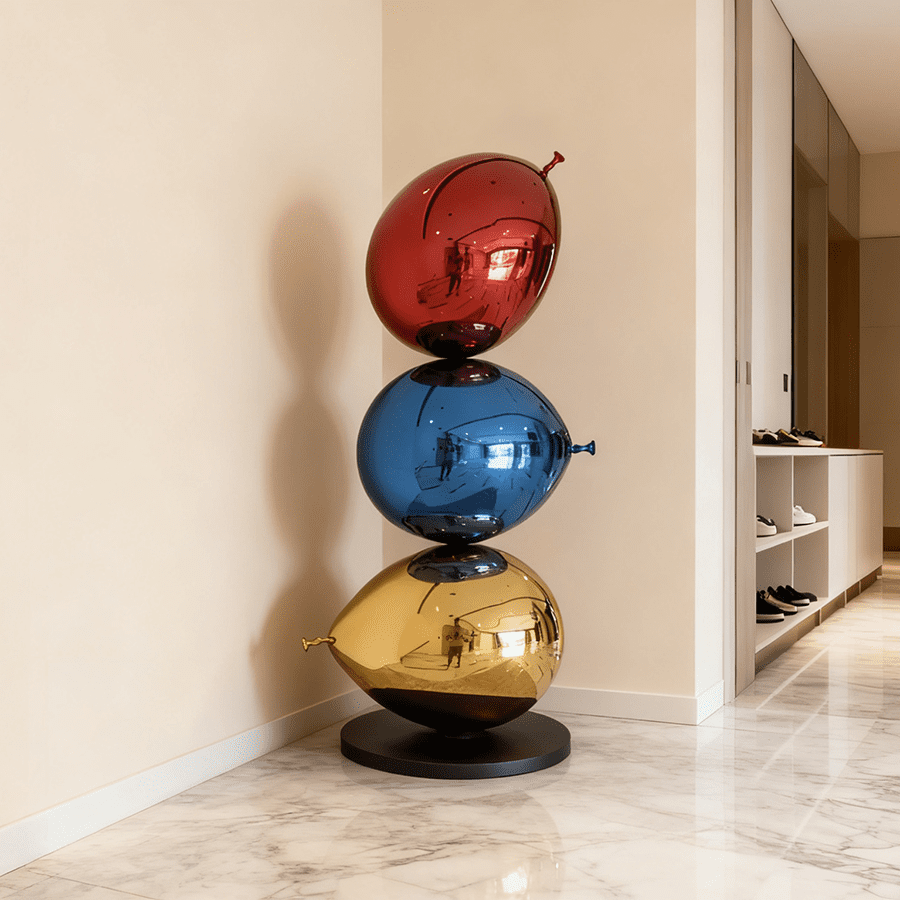Each balloon is sculpted with smooth curvature, a realistic knot detail, and precision welding that ensures a seamless, fluid appearance. The sculpture is supported by a stable round base, offering secure placement in entryways, living rooms, hallways, galleries, and boutique commercial spaces.