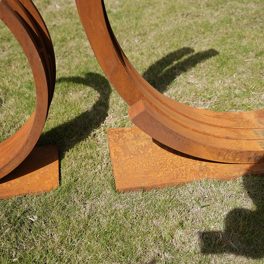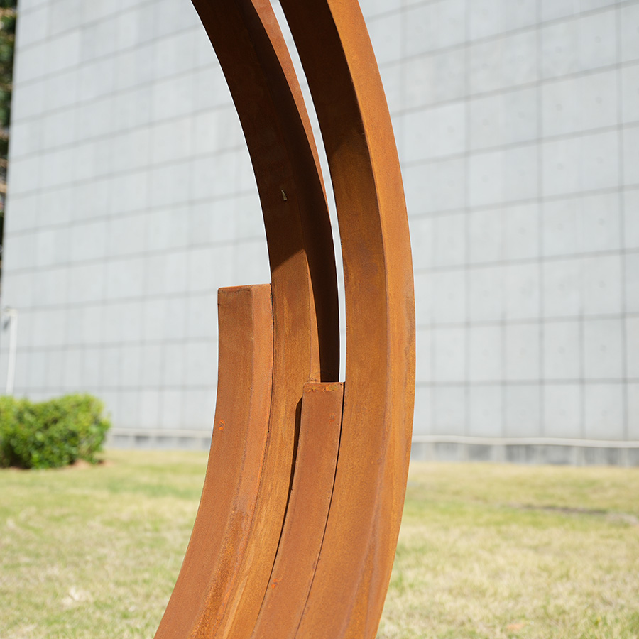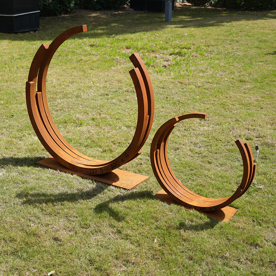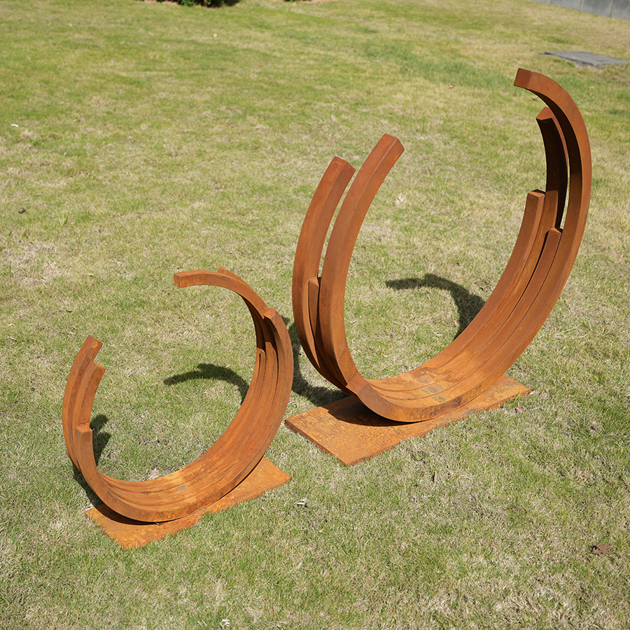 Luxury corten steel crescent arc sculpture designed for poolside landscapes. Durable rust finish with weather-resistant performance, perfect for resorts, hotels, and outdoor spaces.