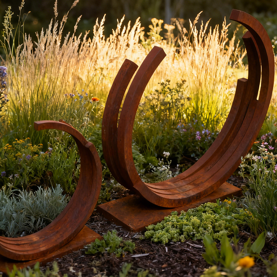 Corten Steel Poolside Sculpture – Crescent Arc Metal Art for Outdoor Landscapes