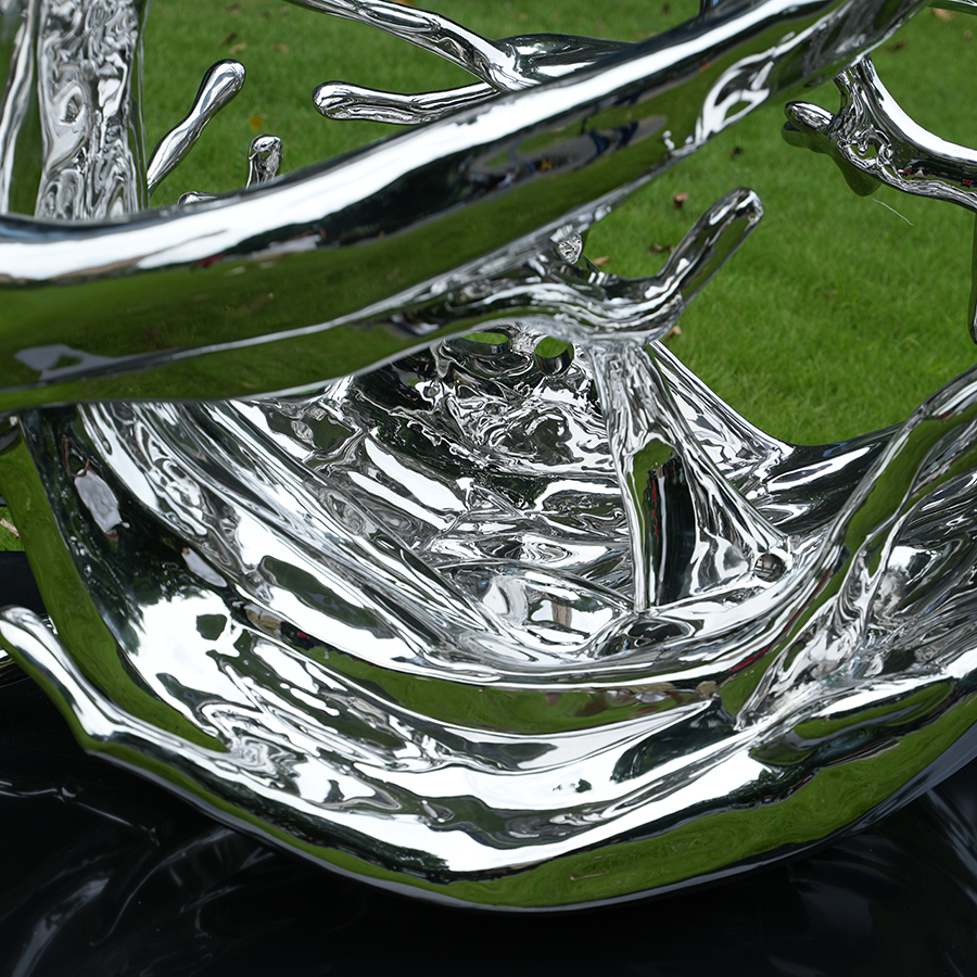 Structural Integrity: Despite its delicate, branching appearance, the sculpture is engineered for stability, mounted on a sleek, minimalist black plinth that provides a stark contrast to the reflective steel.