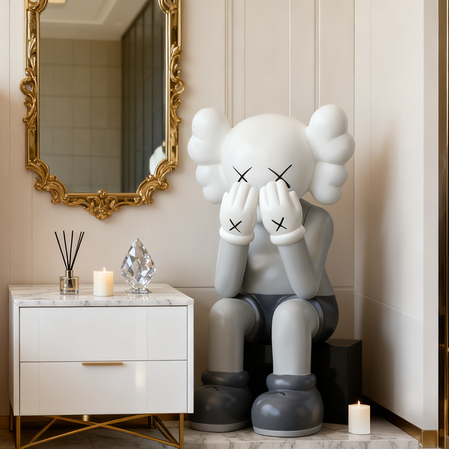 The sculpture’s exaggerated proportions and crossed-eye design embody the essence of urban art and collectible culture, making it an ideal statement piece for homes, art studios, hotels, showrooms, and galleries. Its glossy finish adds depth and sophistication, while its smooth fiberglass construction ensures durability and easy maintenance.