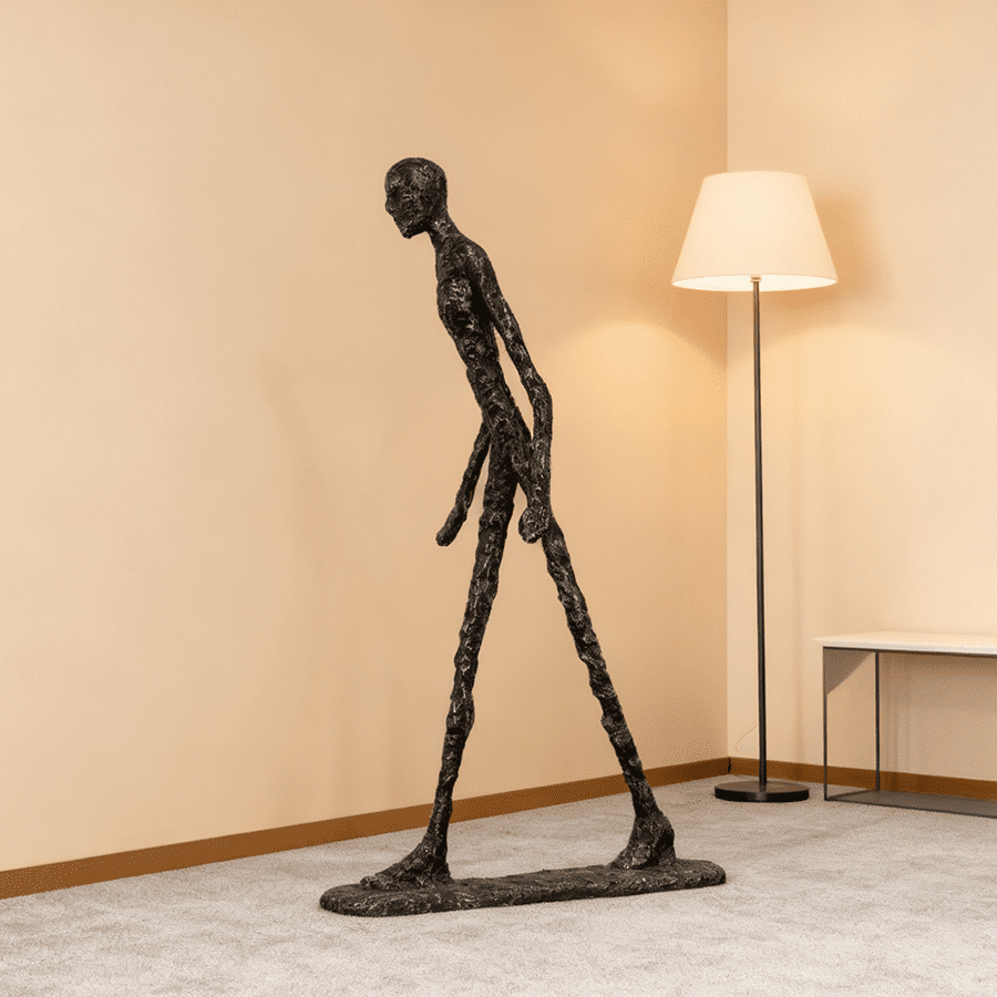 Discover this fiberglass walking man sculpture, a minimalist masterpiece for modern interiors. Perfect for homes, hotels, and galleries, it features a slender abstract design with textured black finish — symbolizing movement and timeless elegance.