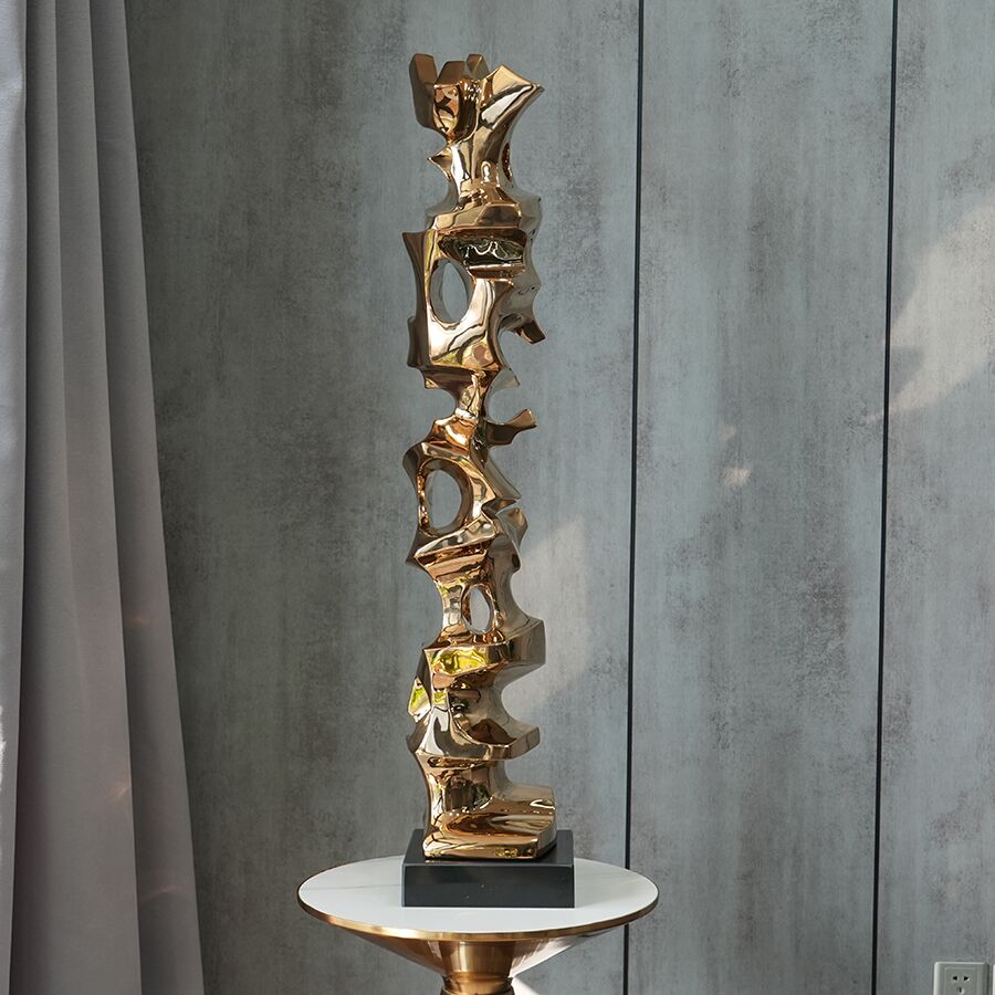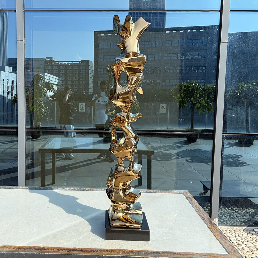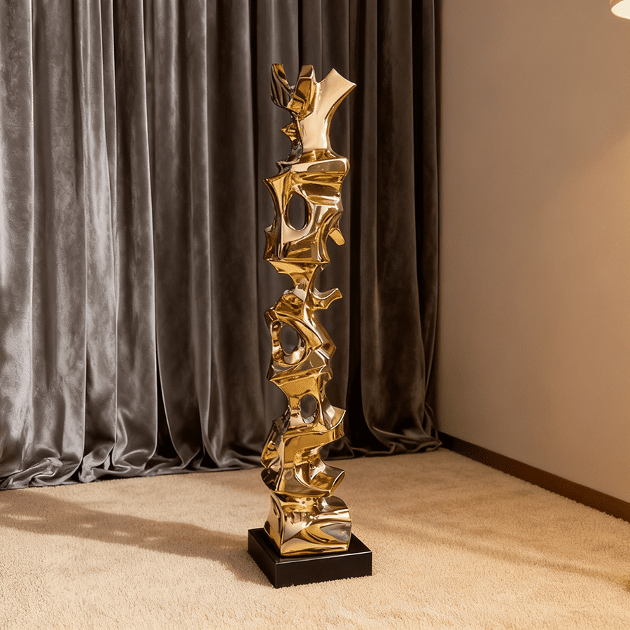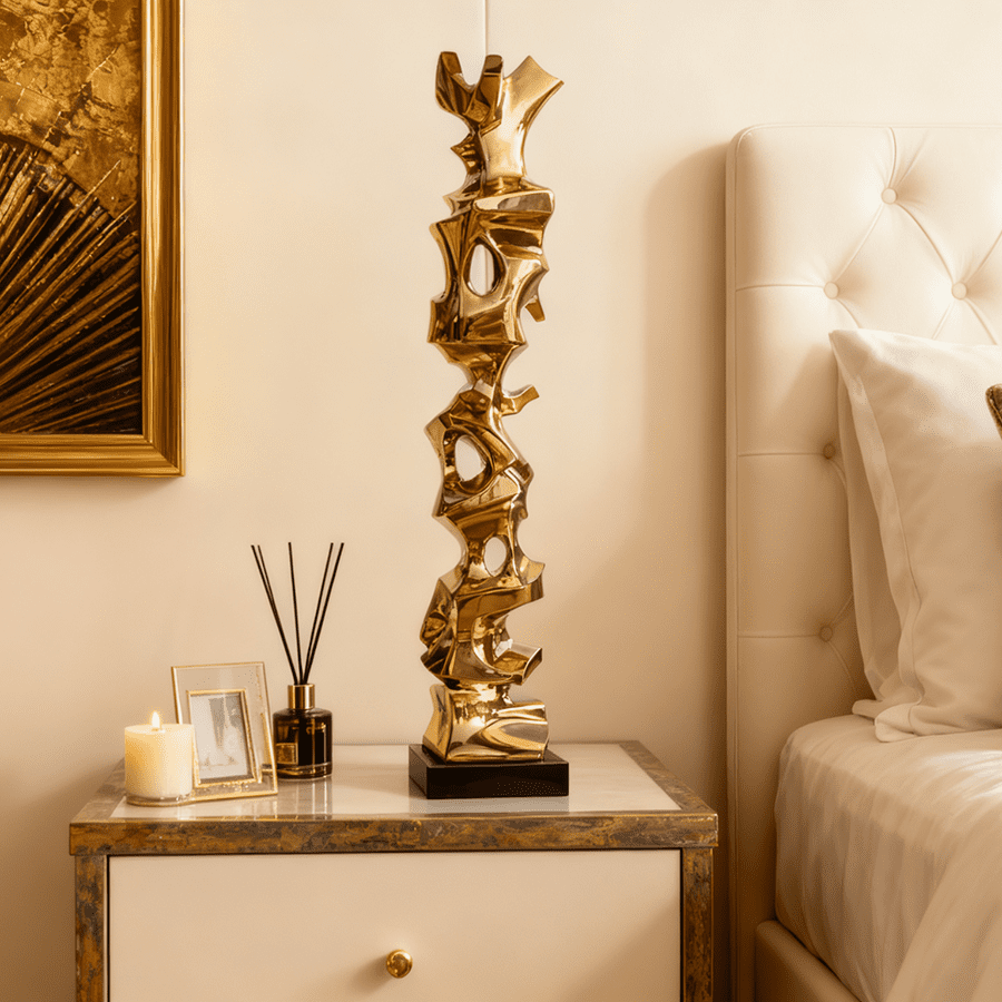 This gold stainless-steel sculpture is an exquisite piece of modern art designed to bring elegance and sophistication into interior spaces. Compact yet striking, it stands gracefully on a bedside table, adding a touch of contemporary luxury to bedrooms, hotels, or high-end residences.