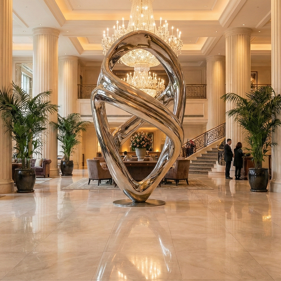 Crafted from high-grade stainless steel, the surface is meticulously mirror polished, allowing the sculpture to reflect surrounding architecture, lighting, and people. In a grand hotel setting, the polished finish amplifies chandeliers, columns, and natural light, creating a dynamic visual dialogue between the artwork and its environment.