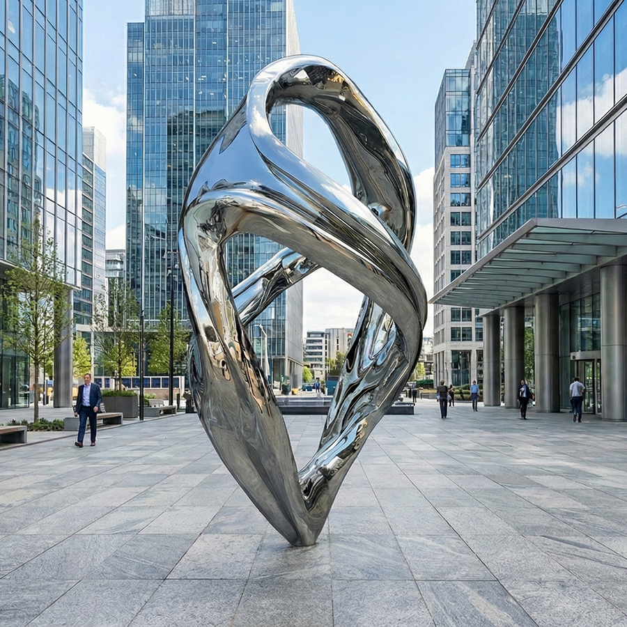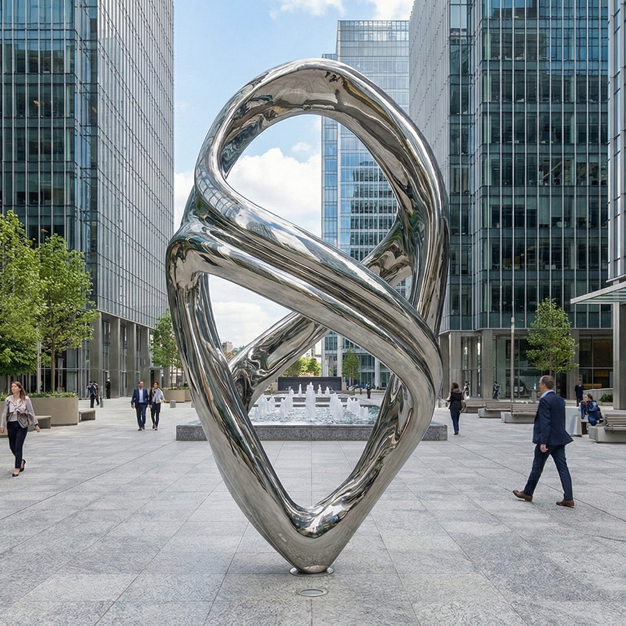 This large-scale stainless steel abstract sculpture is designed as a striking centerpiece for luxury hotel lobbies, grand atriums, and high-end commercial interiors. Featuring a flowing, intertwined form, the sculpture expresses movement, balance, and modern elegance, making it ideal for spaces that demand both visual impact and refined artistry.
