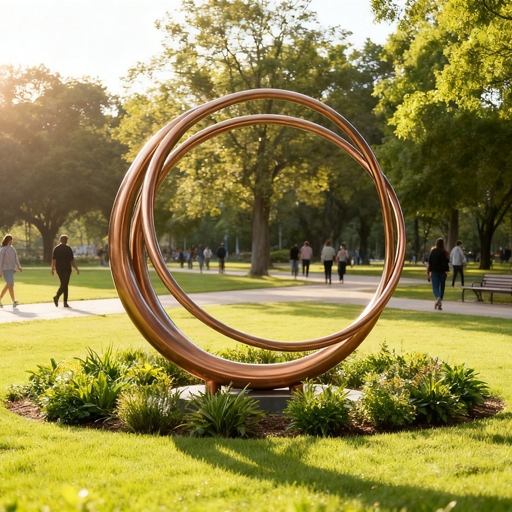 This 2.5-meter diameter steel sculpture is a striking piece of modern art, designed to transform outdoor spaces into visually captivating environments. Crafted with precision, the sculpture features multiple intertwined circular rings, symbolizing unity, continuity, and balance. Its clean, minimalist design complements both contemporary and natural settings, making it ideal for public parks, city squares, gardens, and architectural landscapes.