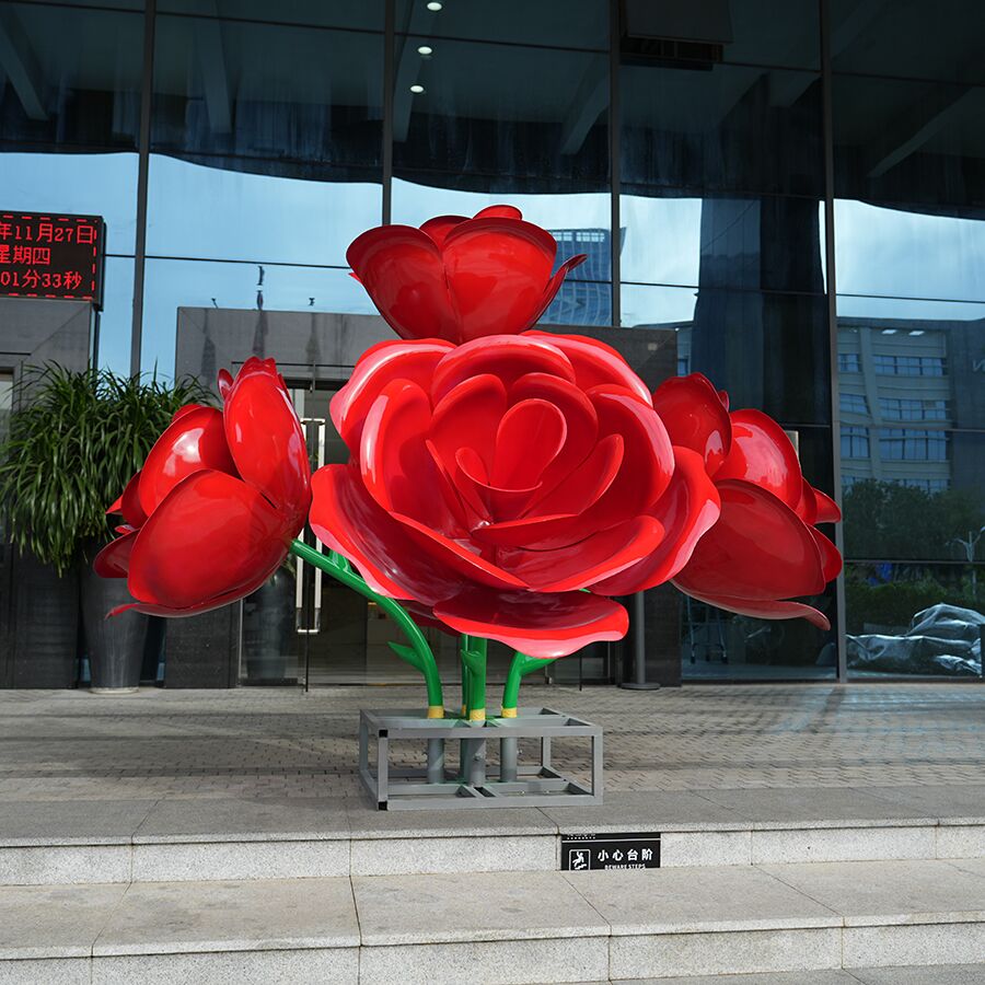 The sculpture is finished in a high-gloss automotive-grade red coating, giving the roses a vibrant, eye-catching presence that contrasts beautifully with modern glass architecture and green lawns. The reflective surface enhances depth and color saturation under natural daylight, making it highly visible from a distance.