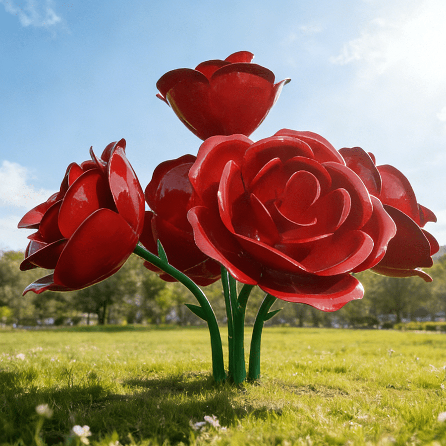This striking stainless steel rose sculpture features a cluster of oversized, fully bloomed red roses rising organically from sculpted green stems. The petals are crafted with smooth, flowing contours, layered to create a lifelike floral rhythm while maintaining a bold, contemporary aesthetic.