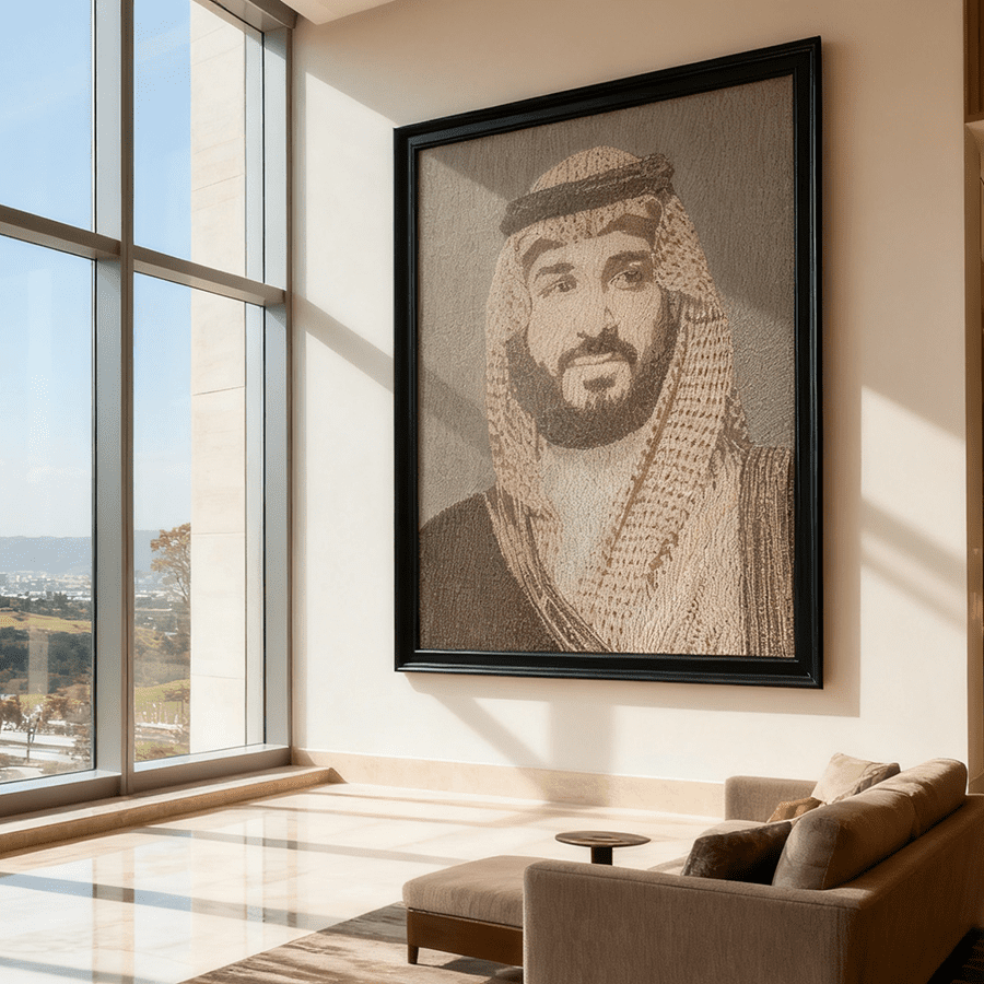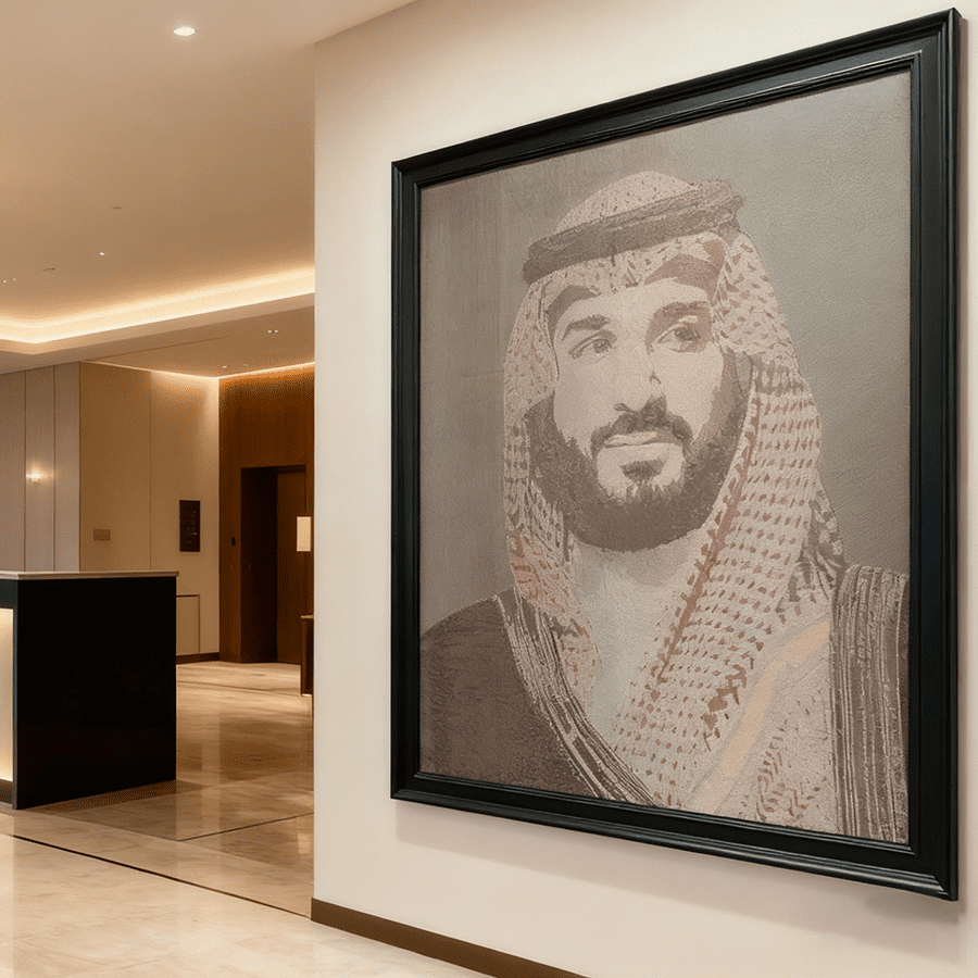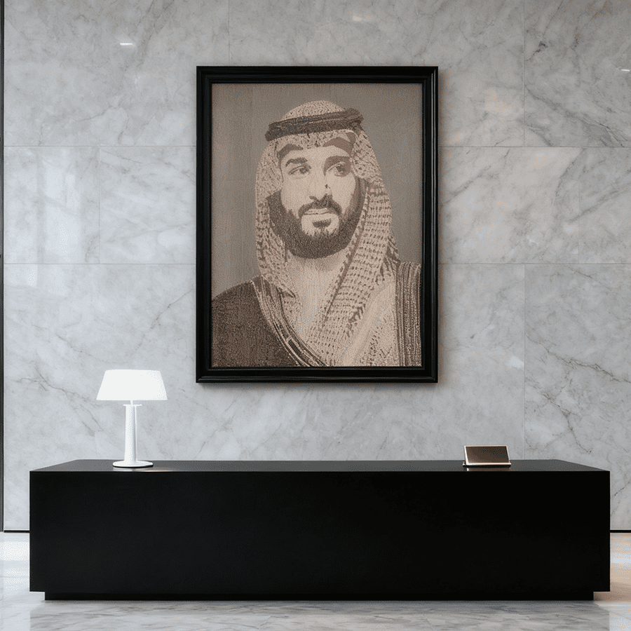 This artwork is a custom portrait crafted entirely from fine brass wire, showcasing remarkable precision and artistry. Each strand of brass wire is meticulously bent, layered, and intertwined to form detailed facial features, expressions, and textures, giving the portrait both depth and character. Mounted within a sleek black frame, the portrait blends traditional handcraft with contemporary style, making it a striking statement piece for luxury interiors, offices, hotels, and art collections.