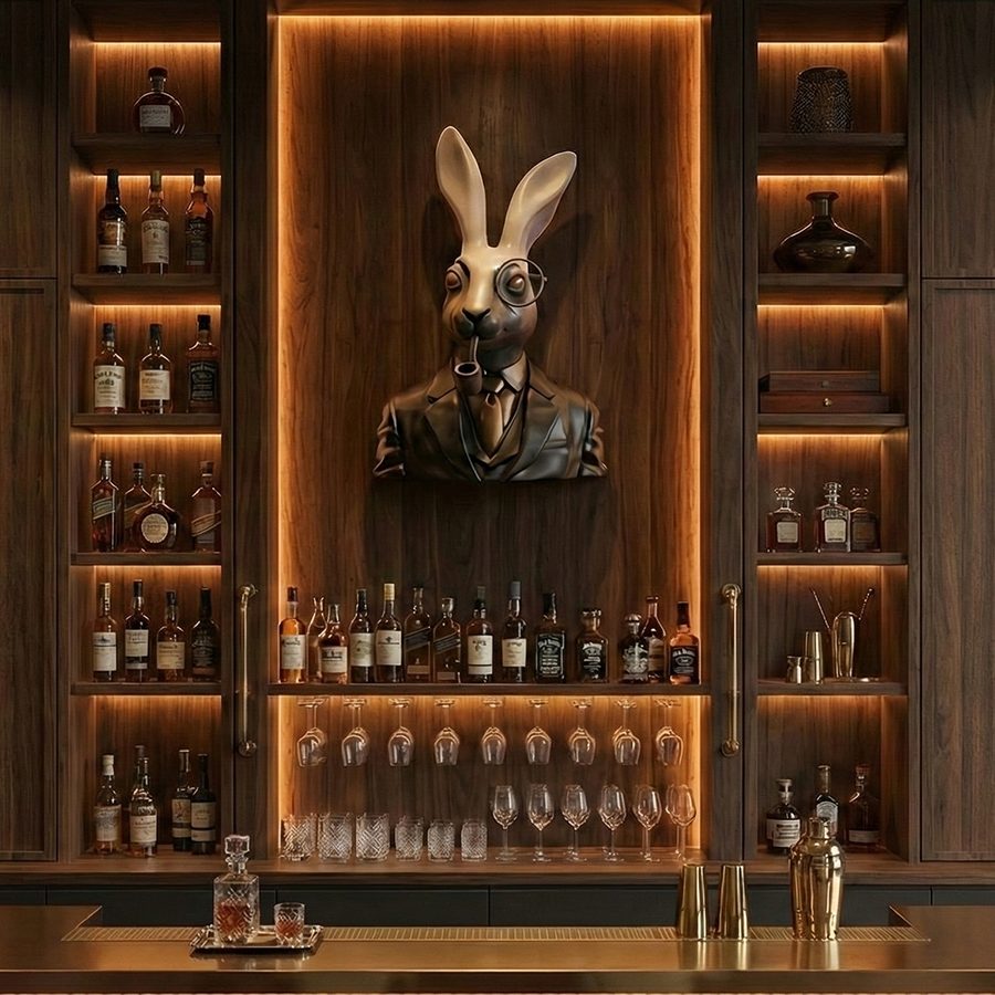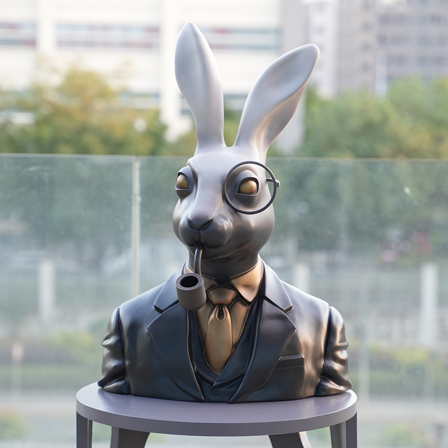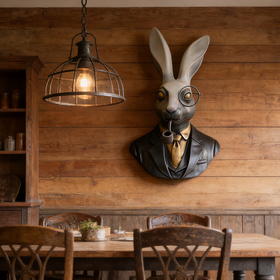 This fiberglass rabbit wall sculpture blends playful imagination with refined craftsmanship, creating a striking focal point for luxury interiors. Designed as a half-body wall-mounted bust, the rabbit is portrayed in a tailored suit, complete with a pipe and monocle, adding a sense of wit, intellect, and narrative depth.