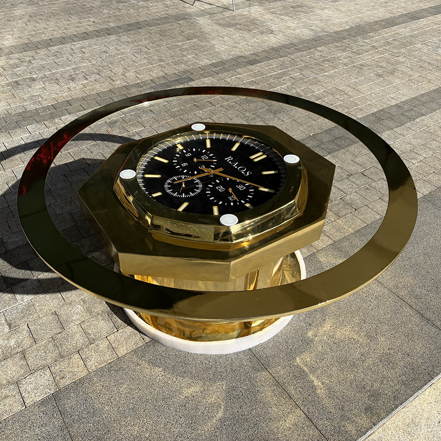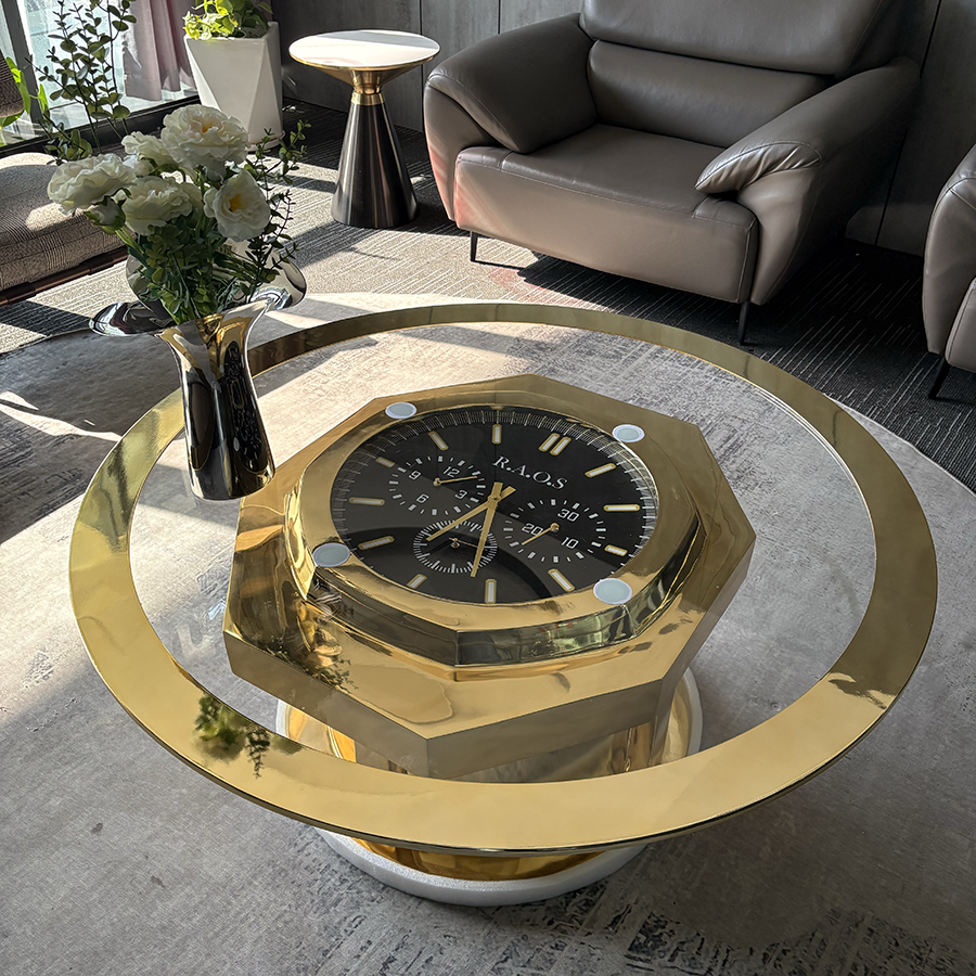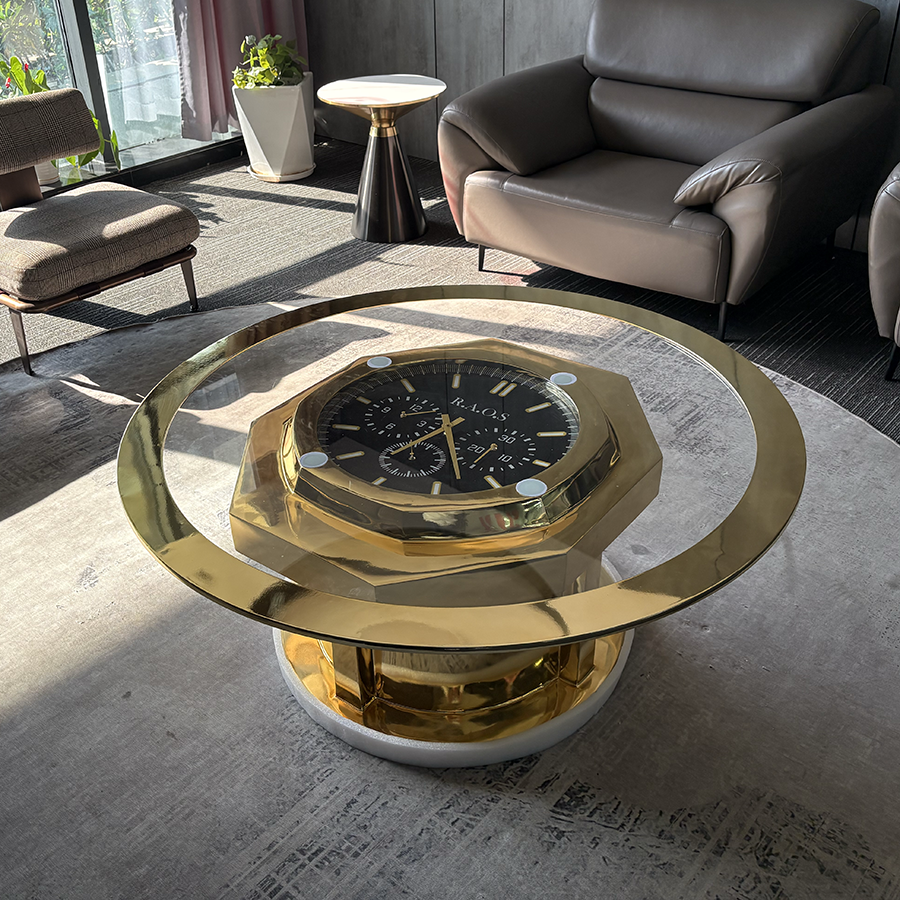 A Timeless Centerpiece of Functional Art This sculpture-inspired coffee table is a masterclass in horological design and metalwork. By embedding a large-scale, detailed clock face within a structural stainless steel frame, it transforms a standard piece of furniture into a conversational landmark.