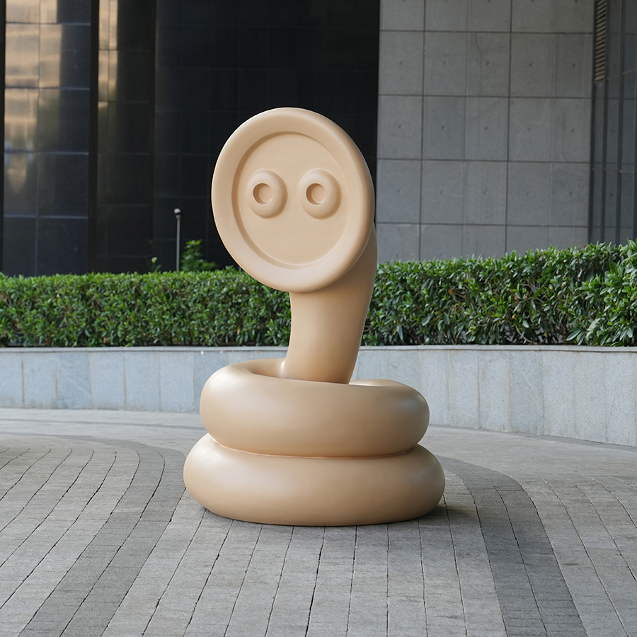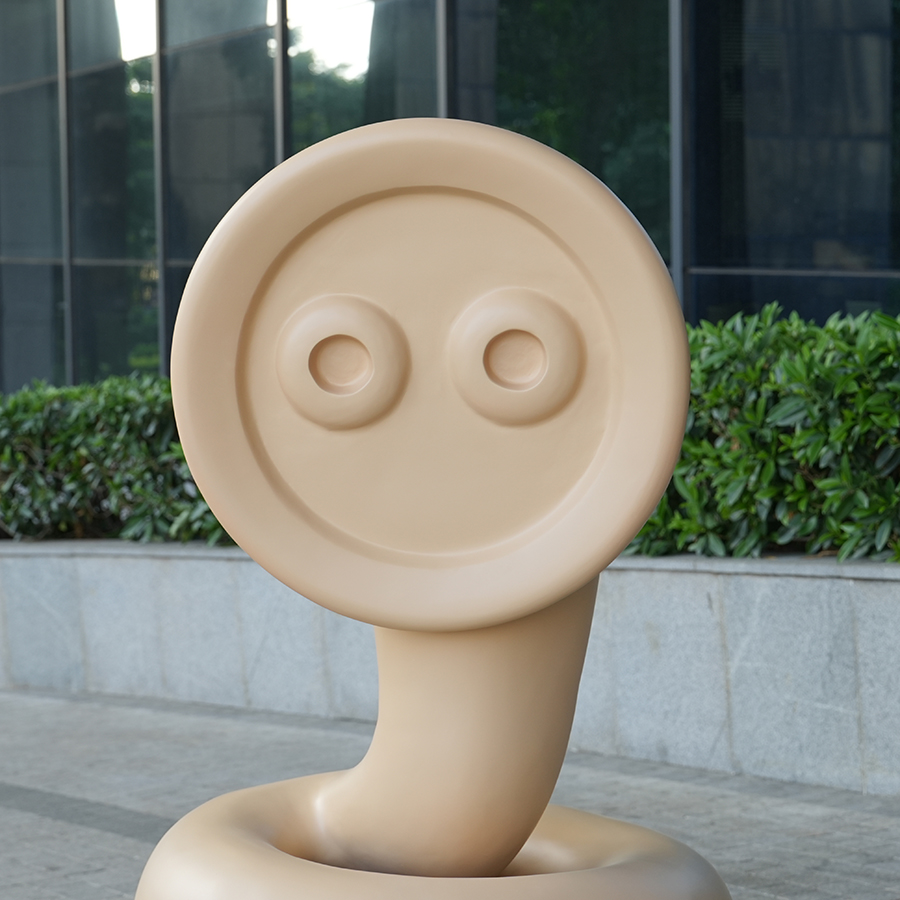 This fiberglass interior sculpture features a playful yet minimalist abstract figure with a rounded, button-like face and a soft, coiled base. The form is smooth, organic, and intentionally simplified, giving the piece a calm, contemporary character that blends effortlessly into modern interiors.