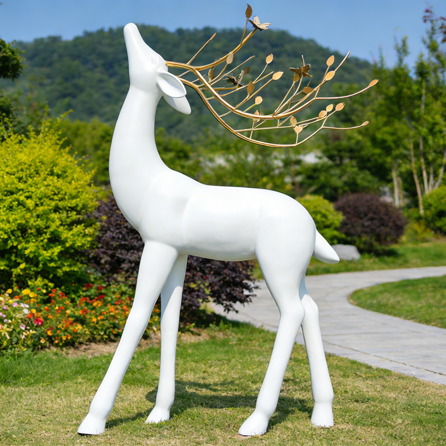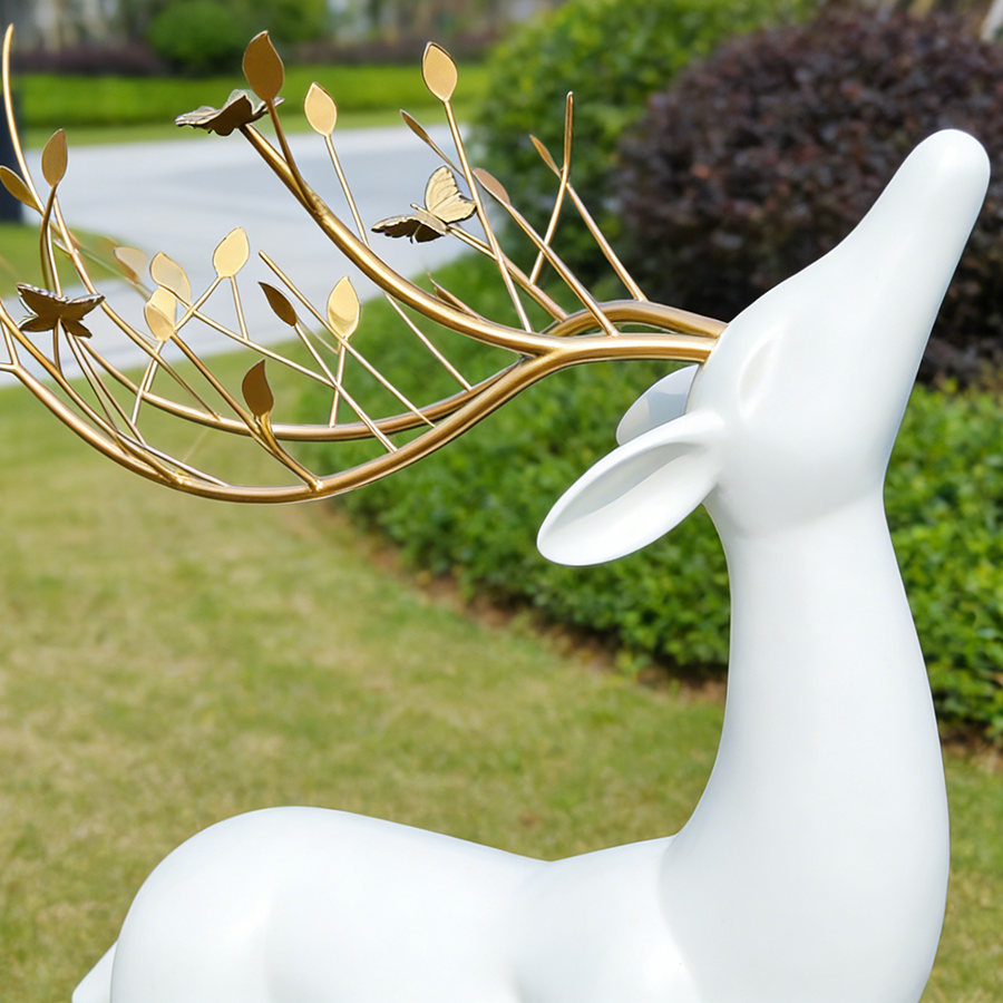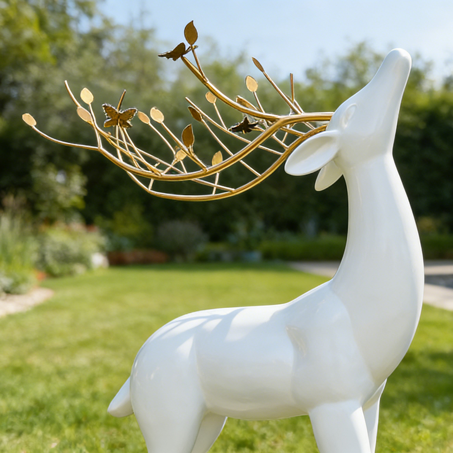 This steel deer sculpture is a refined statement piece designed for gardens, courtyards, and landscape projects. Featuring a sleek, minimalist deer form, the sculpture combines a smooth white body with elegant metallic antlers that branch outward like delicate foliage. The contrast between the polished steel surface and the organic antler structure creates a calm yet striking visual presence.