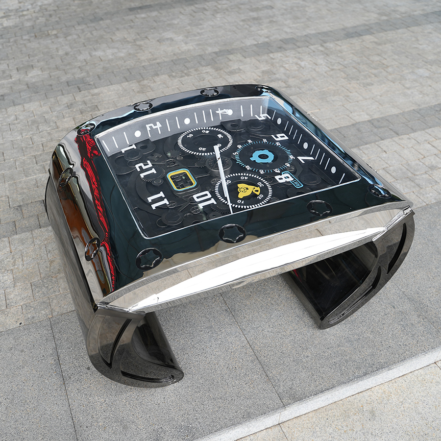 This stainless steel coffee table with built-in clock is a striking fusion of functional furniture and sculptural art. Designed as a statement centerpiece, the table integrates a precision timepiece directly into its structure, transforming time into a visual experience.