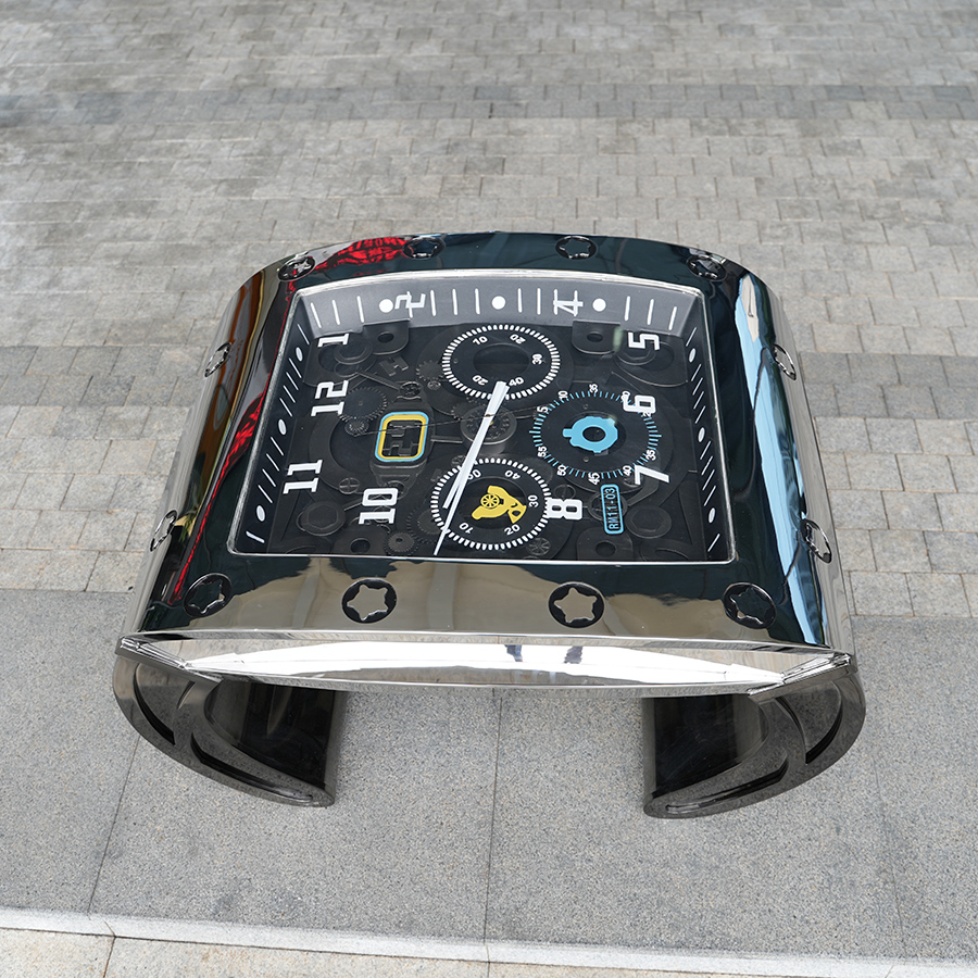 The body is crafted from high-grade stainless steel, meticulously hand-formed into smooth, flowing curves. A mirror-polished finish enhances the reflective surface, allowing the table to interact dynamically with surrounding light and interior materials. The embedded clock mechanism is protected beneath a clear glass top, revealing intricate dial details while maintaining everyday usability as a coffee table.