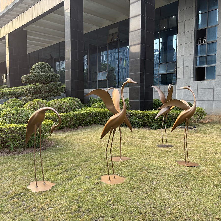 The cranes are designed in varied poses—bending, stretching, and lifting their wings—bringing rhythm and storytelling to outdoor landscapes. Slender legs and concealed base plates ensure visual elegance while providing strong structural stability for long-term outdoor installation. The weather-resistant stainless steel construction makes the sculptures suitable for gardens, corporate campuses, hotel landscapes, public plazas, and luxury residential projects.
