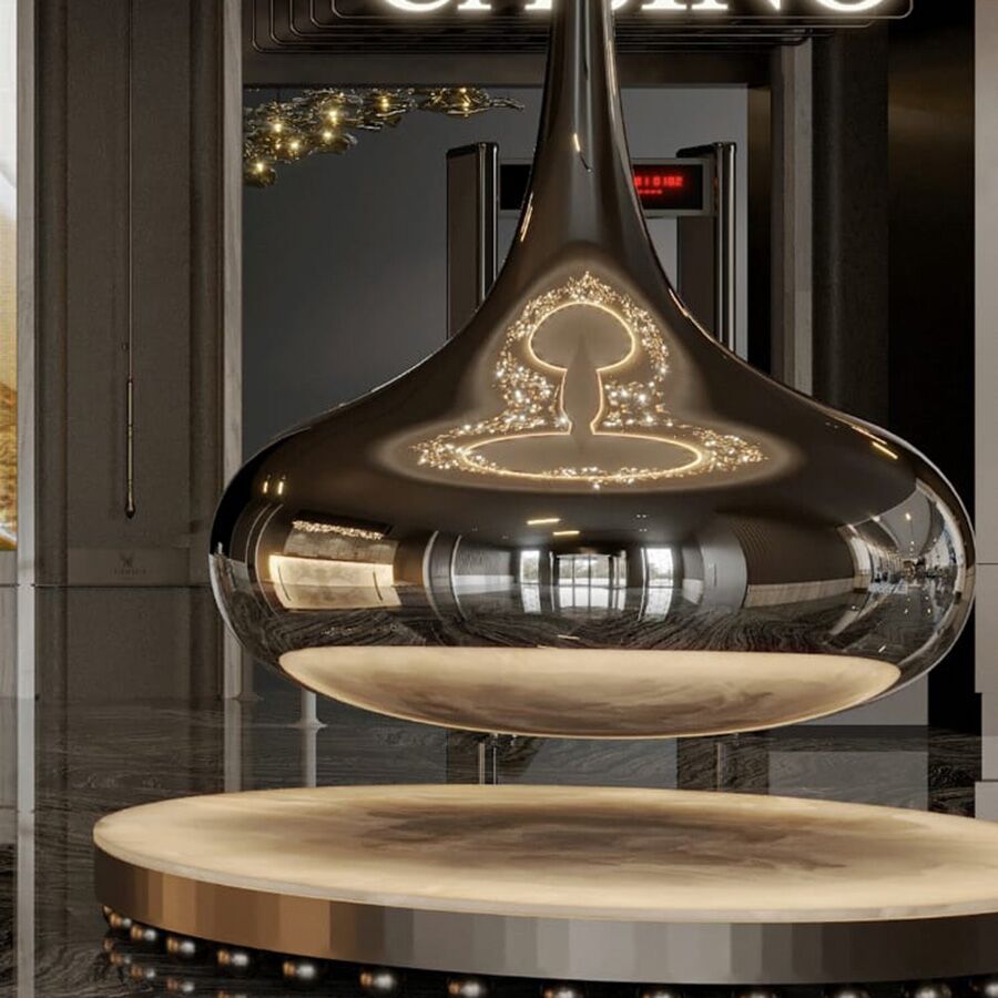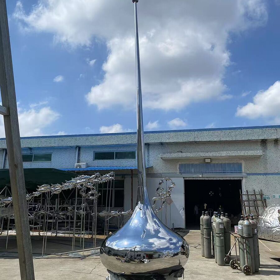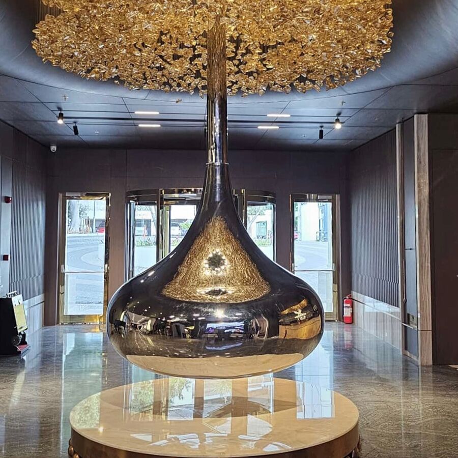 This stainless steel suspended sculpture is an extraordinary centerpiece designed for luxury architectural spaces. Measuring an impressive 6.2 meters in height, the sculpture is suspended from the ceiling, creating a striking floating effect that enhances the sense of grandeur in the lobby. Its fluid droplet-like form symbolizes elegance, innovation, and modern craftsmanship — a visual metaphor for balance and motion frozen in time.