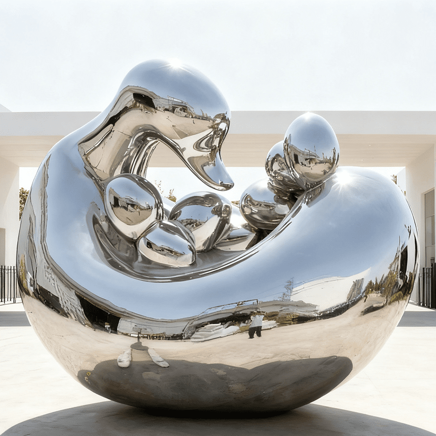 This stainless steel swan sculpture features a mirror-polished finish and elegant abstract design. Perfect for outdoor plazas, resorts, and waterfront landscapes, it symbolizes love, peace, and unity while reflecting its natural surroundings.
