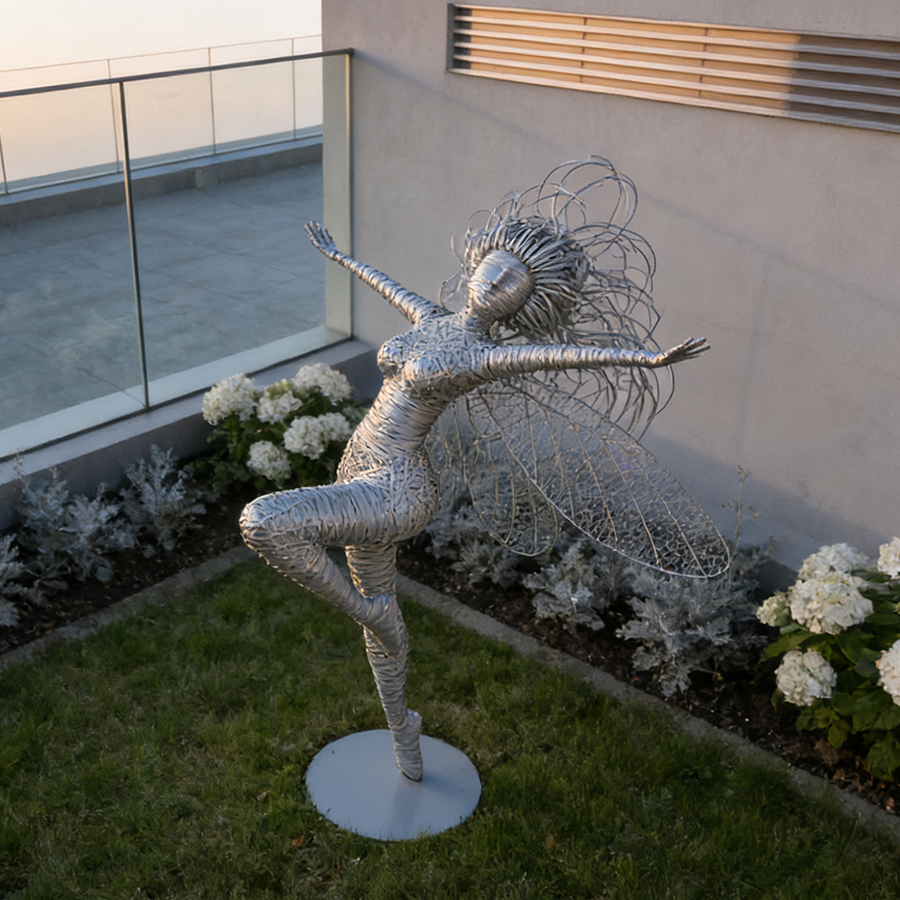 Overview Introducing the “Dancing Spirit,” a masterpiece of contemporary wire art. This ethereal stainless steel sculpture captures the fleeting moment of a fairy taking flight, embodying joy, freedom, and the uncontainable energy of nature. Perfectly balanced and expertly crafted, this piece serves as a breathtaking focal point for luxury terraces, private gardens, or modern atriums.